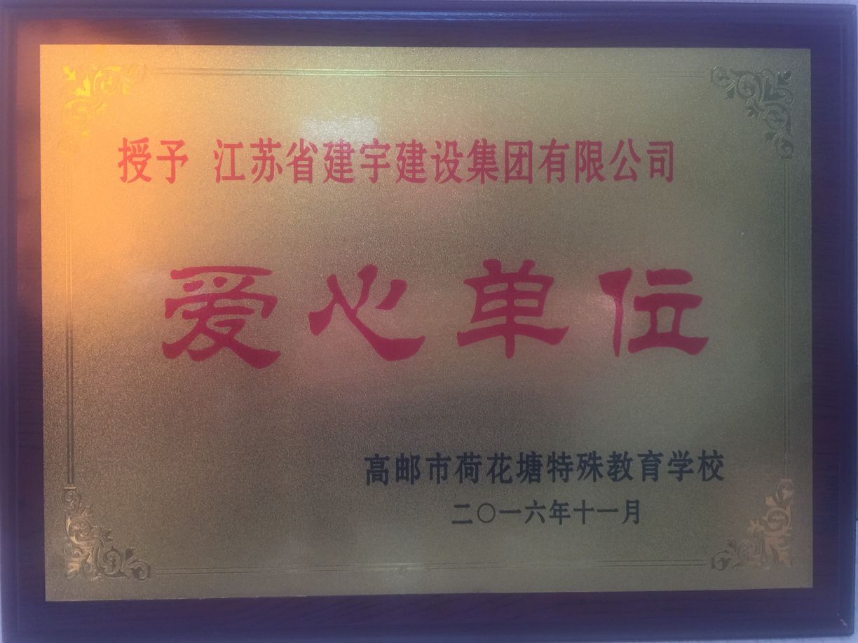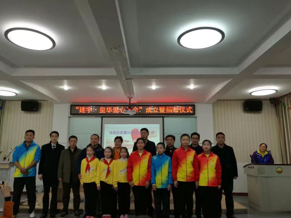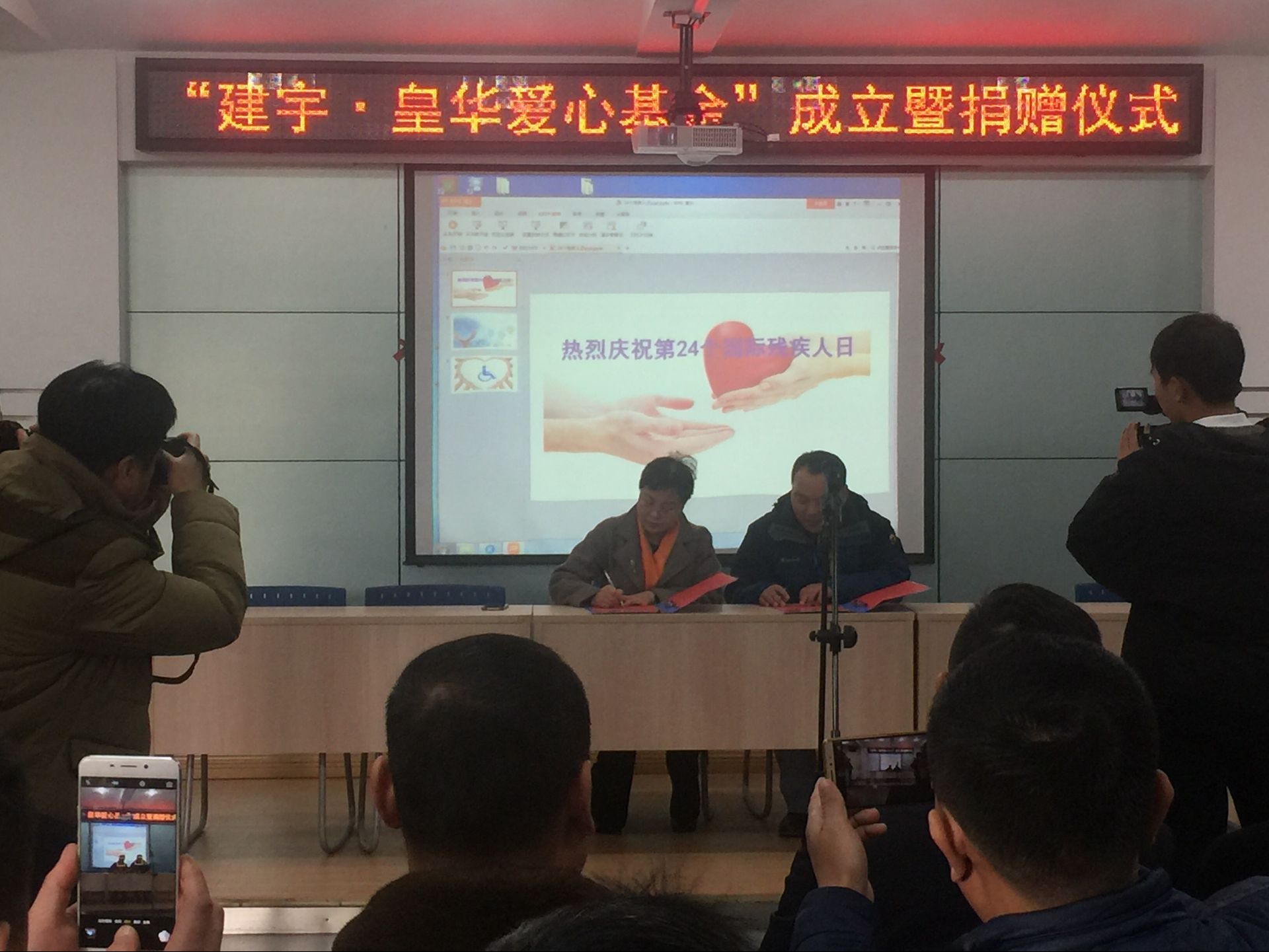 荷花塘特校劉春林校長致歡迎詞,對建宇?皇華愛心基金的捐贈表達(dá)了謝意和敬意,并表示按捐贈協(xié)議規(guī)范用好善款,發(fā)揮其最大功效。市教育局邵局長高度評價了建宇集團的此項善舉,對一直支持教育事業(yè)、熱衷公益的管民良董事長表示感謝,盛贊集團是高郵的重要企業(yè),是一個社會責(zé)任感很強的企業(yè),多年來得到了社會各界的好評。隨后董事長管民良代表集團捐贈,皇華國際大酒店王衛(wèi)紅董事長代表集團簽約,殘聯(lián)吉平副理事長為建宇集團及管民良董事長頒發(fā)“愛心單位”牌匾和“愛心使者”證書,特校學(xué)生還表演了精心準(zhǔn)備的文藝節(jié)目。