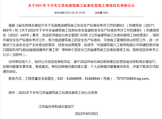 “江蘇省建筑施工標準化星級工地”是由江蘇省住房和城鄉(xiāng)建設廳每年組織評選,旨在表揚全省在安全生產標準化、文明施工管理和揚塵防控工作表現(xiàn)突出的單位,是江蘇省在安全文明施工方面的最高獎項。