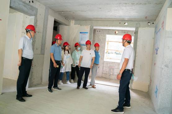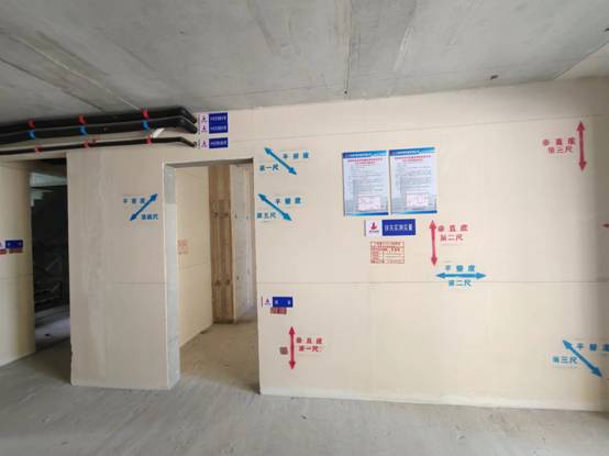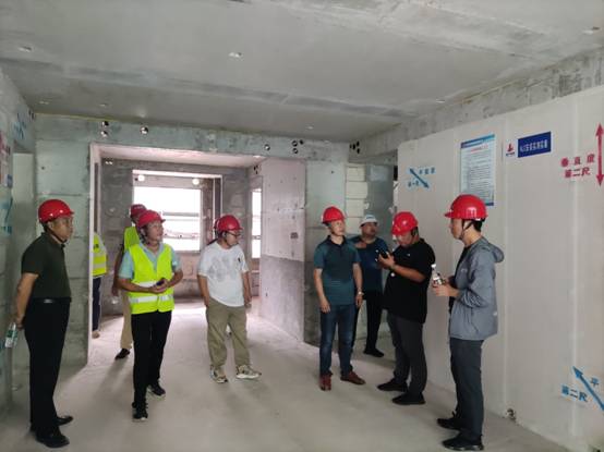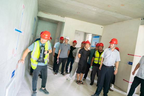 全體觀摩人員同樣分成了三組,在項目現(xiàn)場管理人員的帶領下深入施工場地,重點觀摩了14#樓、22#樓、26#樓粉刷施工工藝樣板、實測實量樣板;預制剪力墻、預制疊合板、預制樓梯、ALC板等施工成型質(zhì)量情況。