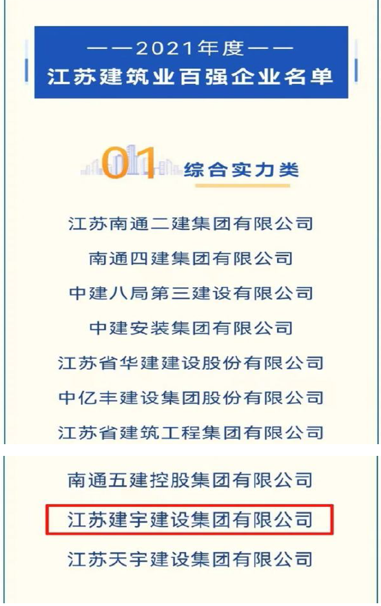 8月18日,2021年度江蘇省建筑業(yè)百強(qiáng)企業(yè)最終名單公布,集團(tuán)榮獲“2021年度江蘇省建筑業(yè)百強(qiáng)企業(yè)”榮譽(yù)稱號,充分展現(xiàn)了集團(tuán)綜合實(shí)力和品牌影響力。