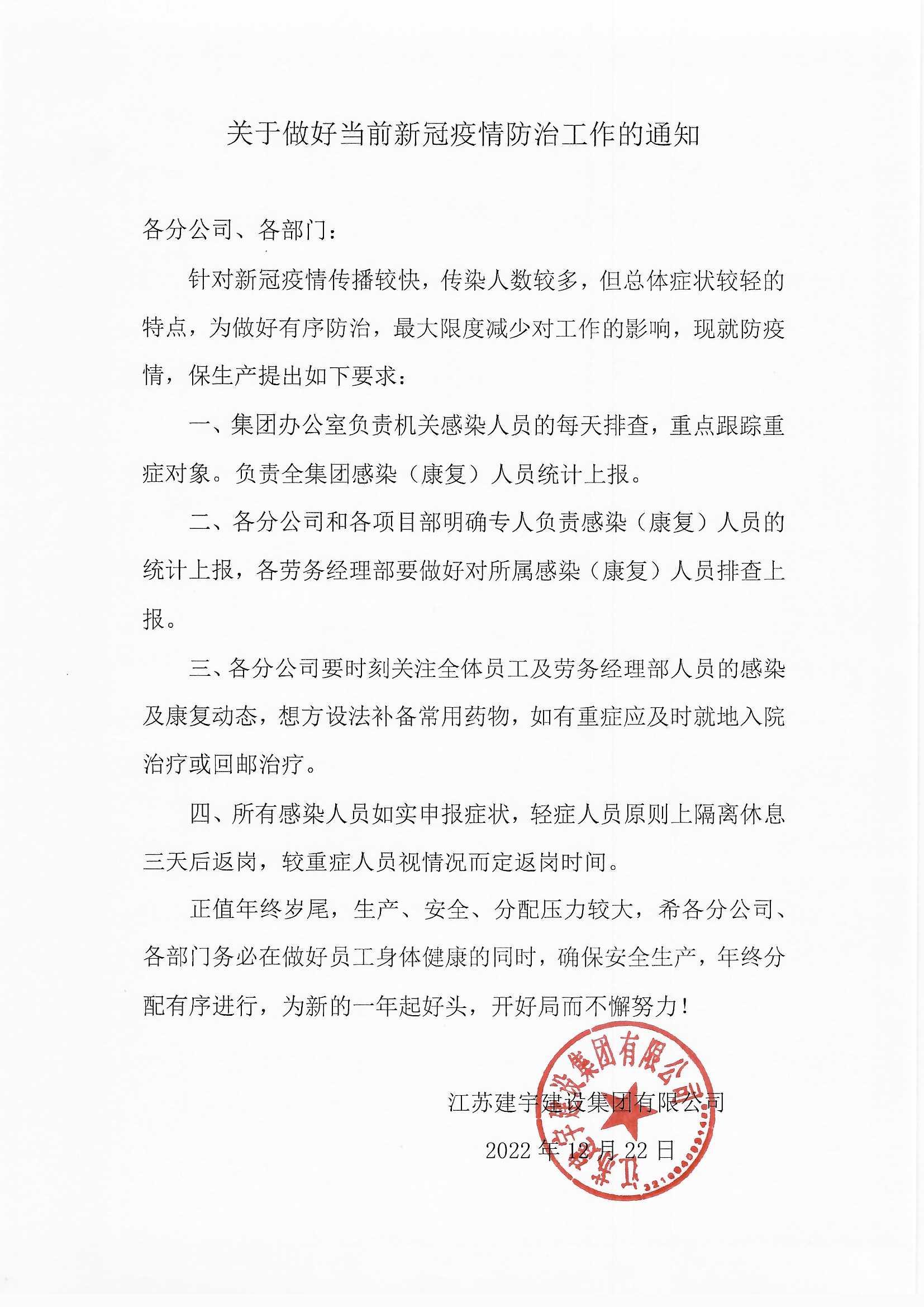 隨著疫情防控新十條的發(fā)布,集團(tuán)針對(duì)疫情防控面臨新形勢、新階段、新任務(wù),及時(shí)調(diào)整防控策略,及時(shí)發(fā)布了《關(guān)于做好當(dāng)前新冠疫情防控通知》,各分公司迅速貫徹實(shí)施,根據(jù)每天感染情況,積極作為。